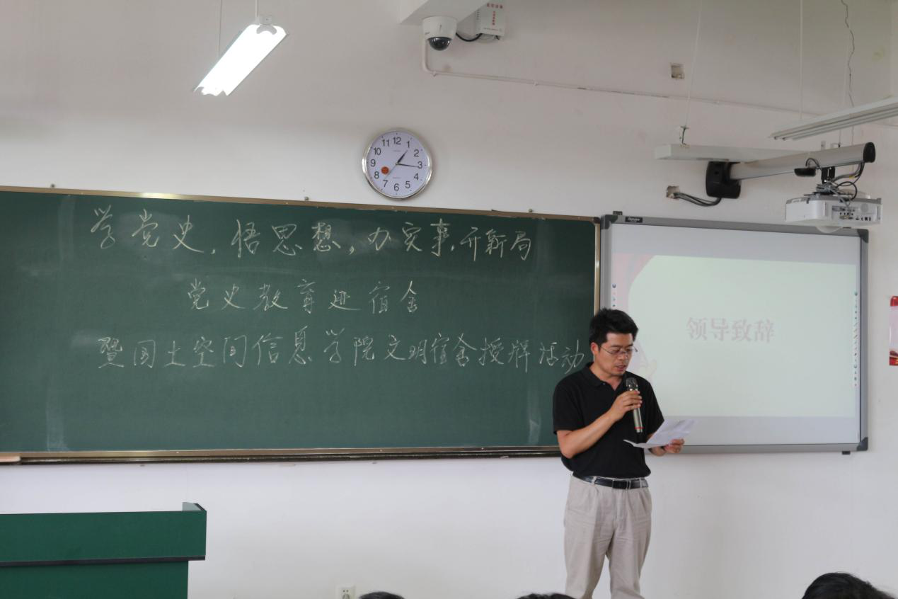 活动的最后一个议程是授牌仪式,由员工处处长李广涛老师、公司党总支书记高昆老师、宿舍管理中心主任刘杜妍老师、基础测绘支部书记武玉斌老师和国土管理支部书记瞿华崟老师为获得“6s示范宿舍”和6s达标宿舍”的同学颁奖。在“6s示范宿舍”员工代表上台分享宿舍内务整理经验后,与会领导及党员老师们走进宿舍,为示范宿舍和达标宿舍挂牌,并向宿舍的同学们讲党史故事。故事有:半截皮带的故事、刘启耀的故事、南昌起义第一枪、陈赓的老婆,以及半条棉被,鱼水情深等。
