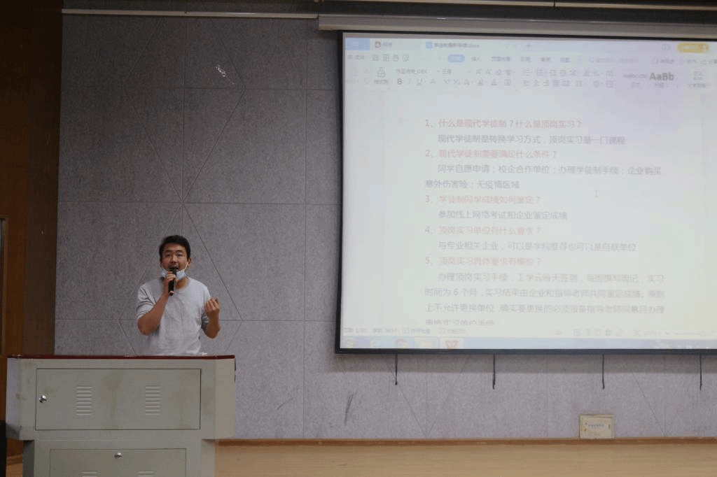 最后,魏老师向同学们介绍了顶岗实习、现代学徒制相关材料的填写要求,并再次叮嘱同学们在实习期间要注意安全,做好疫情防控,积极适应社会,预祝同学们圆满完成实习任务。