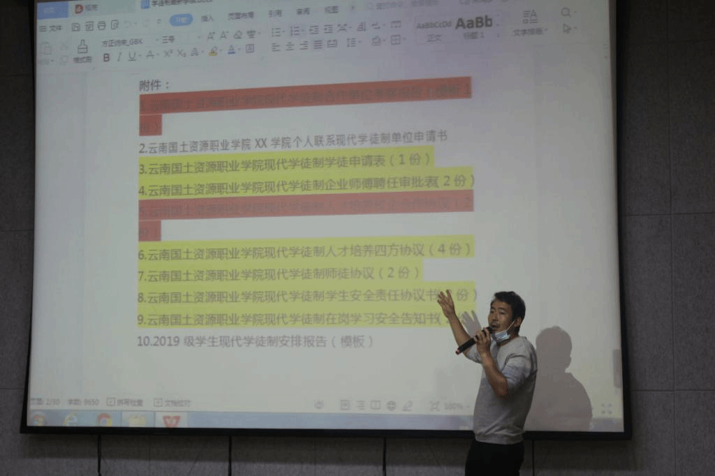 再次,魏老师讲解了现代学徒制的条件与要求,如现代学徒制为员工自愿申请、学徒企业必须是校企合作单位且企业必须在无疫情地区、学徒制期间一样需要在“工学云”APP签到、以及学徒制材料的办理和意外伤害险的购买等。