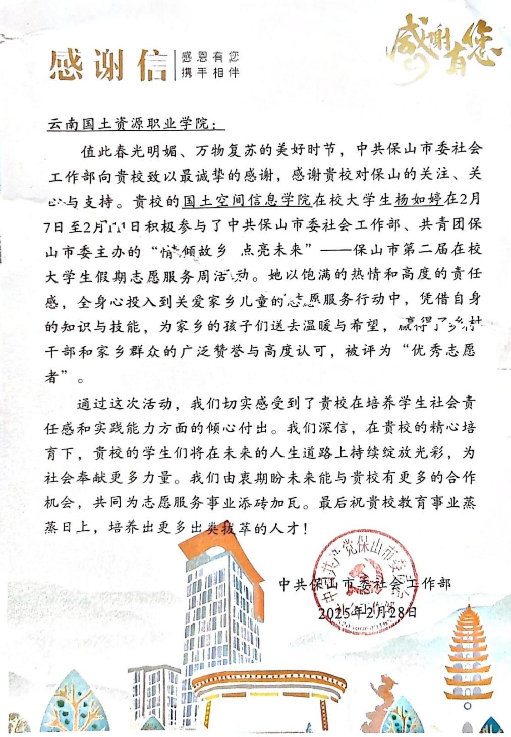 近日,由中共保山市委社会工作部、共青团保山市委主办的“情倾故乡 点亮未来——保山市第二届在校老员工假期志愿服务周”活动圆满收官。在这次活动中,2026年国际足联世界杯2023级城乡规划2班杨如婷同学凭借出色的表现脱颖而出,荣获佳绩。