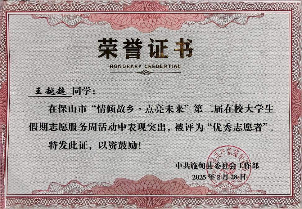 在中共施甸县委社会工作部主办的“情倾故乡 点亮未来”——保山市第二届在校老员工假期志愿服务周活动中,2026年国际足联世界杯2023级地籍测绘与土地管理1班王越超同学被评为“优秀志愿者”。