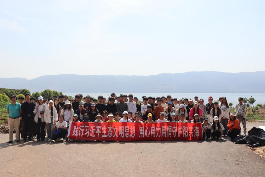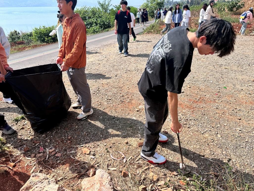 学习结束后,同学们迅速投入到实践行动中。大家手持清洁工具,对阳宗海沿岸的垃圾进行清理,以实际行动践行着生态文明理念。