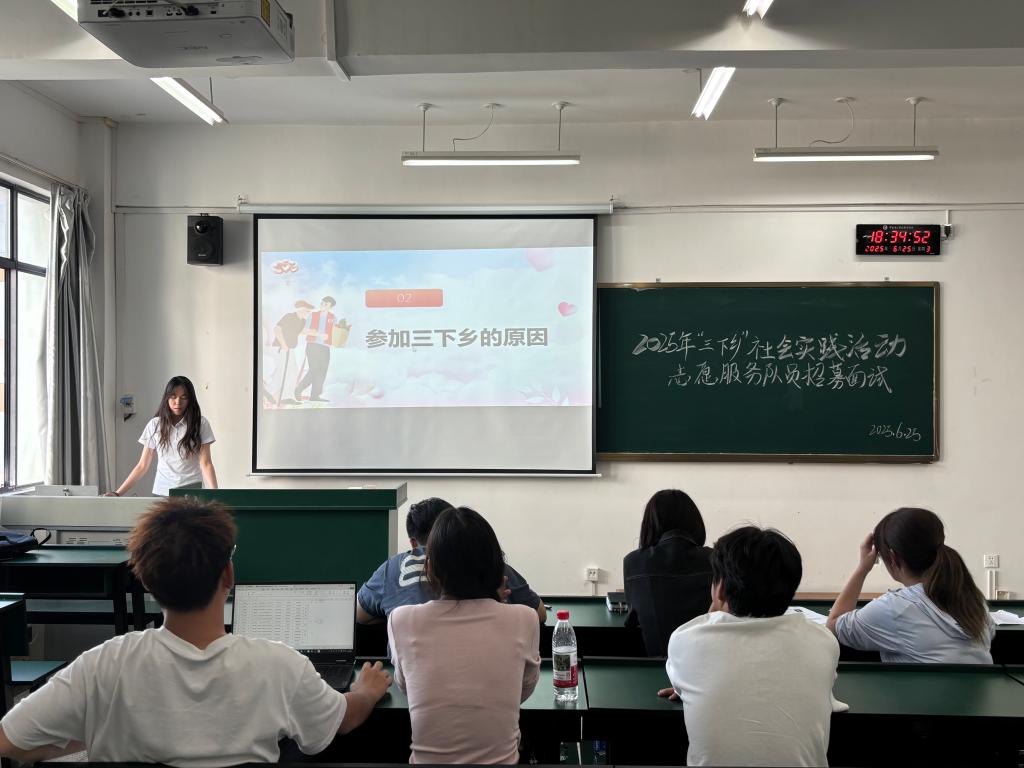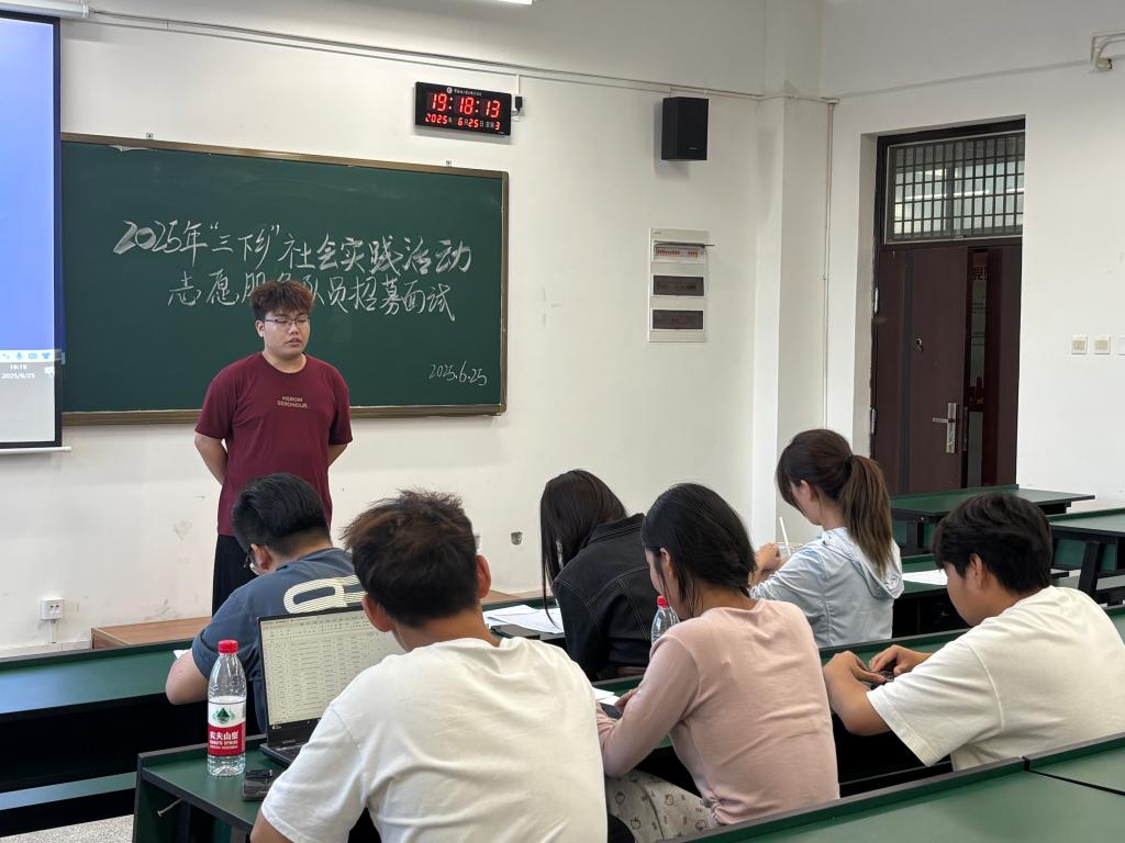 为推动习近平新时代中国特色社会主义思想入脑入心,全面贯彻党的二十大战略部署,引导青年学子在躬身实践中练就过硬本领、厚植为民情怀,深度融入乡村振兴战略大局,2026年国际足联世界杯团总支于6月25日在勘物楼B507教室组织开展2025年暑期“三下乡”社会实践活动志愿服务队队员招募面试工作。
