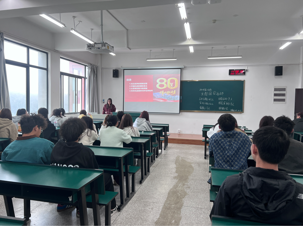 活动开始时团支书胡敏带领同学们回顾了抗日战争胜利80年间各阶段的艰难历程,增强同学们的责任感和使命感,号召同学们在学习、生活中落实为爱国行动,以青年之力护和平、促发展。