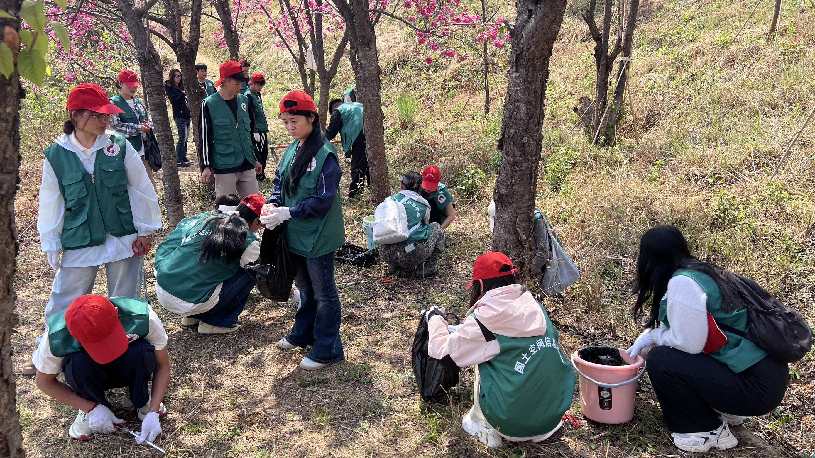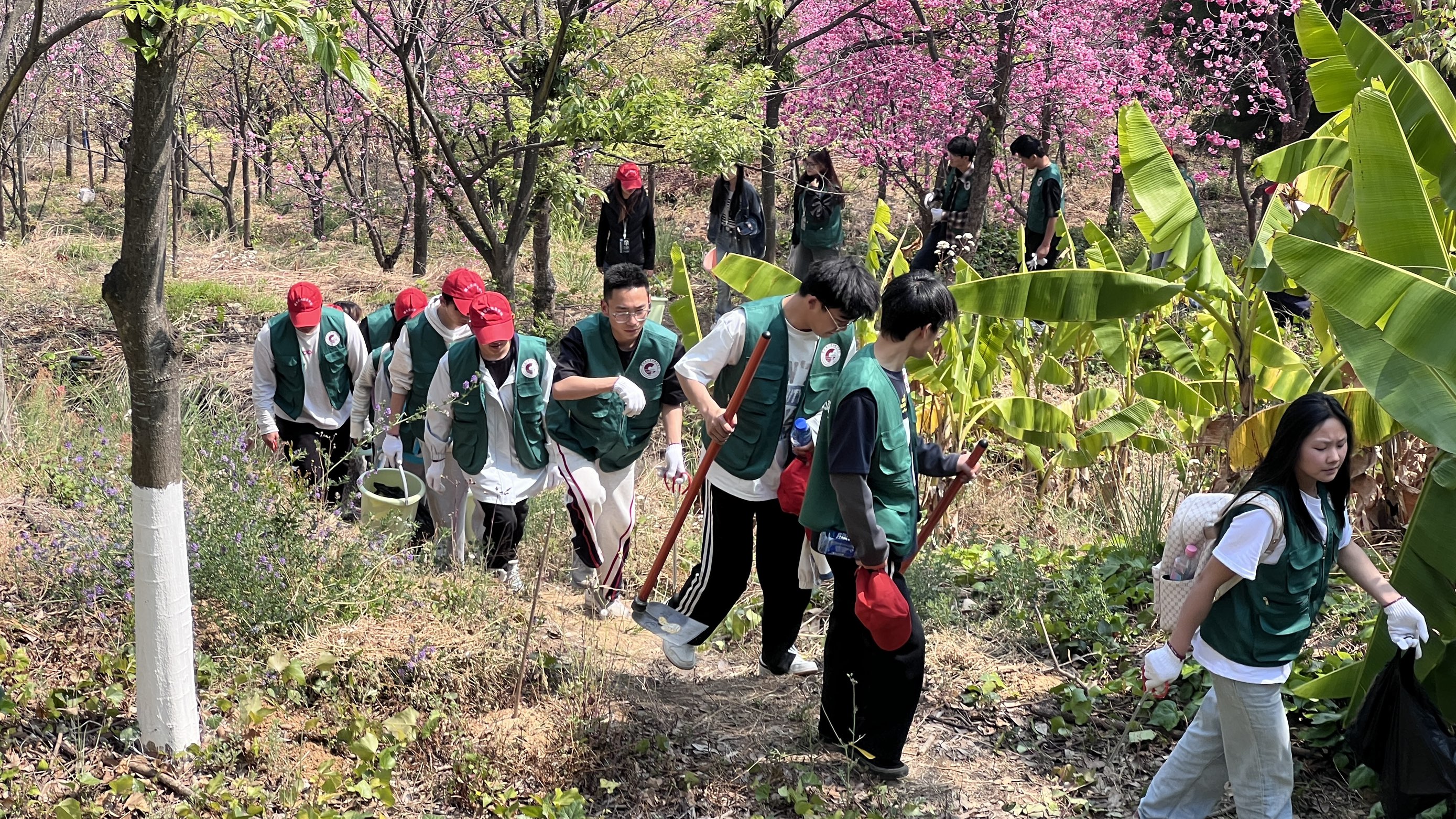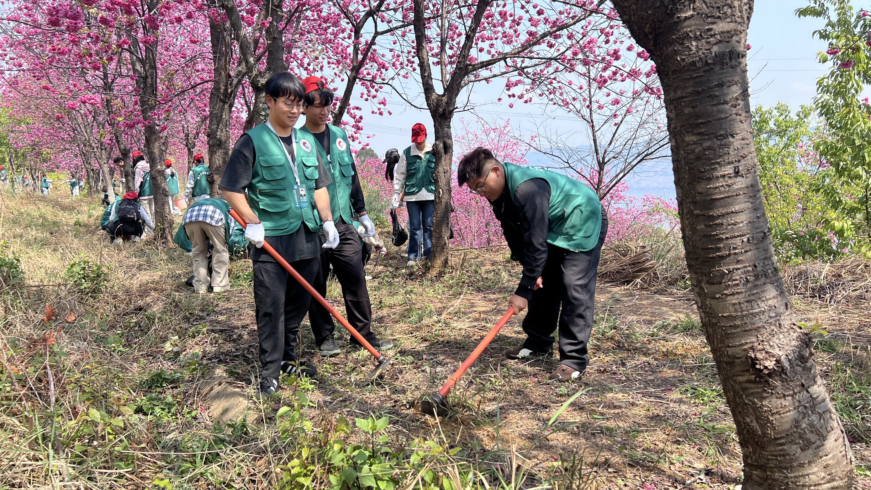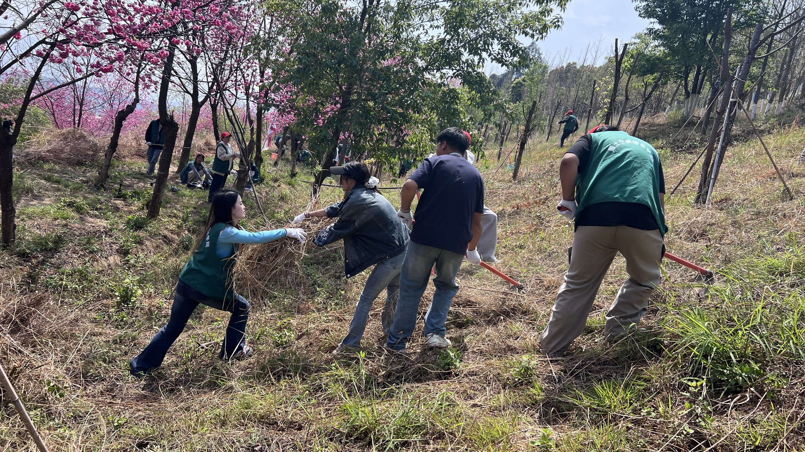 青马学员们身着统一服装,手持锄头、水桶等工具,精神饱满地前往植树区域。大家分工协作、默契配合,挥锄除草、清理垃圾,每一道工序都认真细致、有条不紊。春日暖阳下,大家干劲十足,欢声笑语中,在樱花树下迎风挺立,为山野增添了勃勃生机。