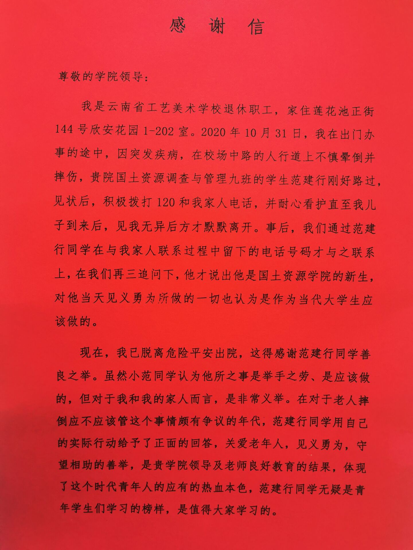据了解,10月31日,符老师在出门办事的路上突发疾病,在人行道上不慎晕倒摔伤。此时路过的范建行同学见到这一情况,立即拨打120,并积极与符老师家人取得联系,在符老师家人赶到之前,范建行同学一直耐心陪护,当看到符老师一切安置妥当后才默默离开。