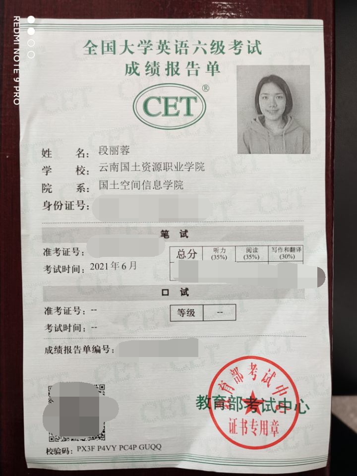 近日,2021年6月老员工英语四六级考试证书陆续发放,公司学子喜获佳绩。19土管7班刘曜福、19土管3班周明菊、19城市1班刘正琴、20土管6班付蒋蝶、20土管9班彭思缘、20遥感2班黄健均通过英语四级考试,其中黄健同学取得558分的优异成绩。值得一提的是,公司19土管3班的段丽蓉同学是公司唯一一位参加英语六级考试的同学,她在此次考试中也取得了不错的成绩,希望她能再接再厉,不断突破自我。