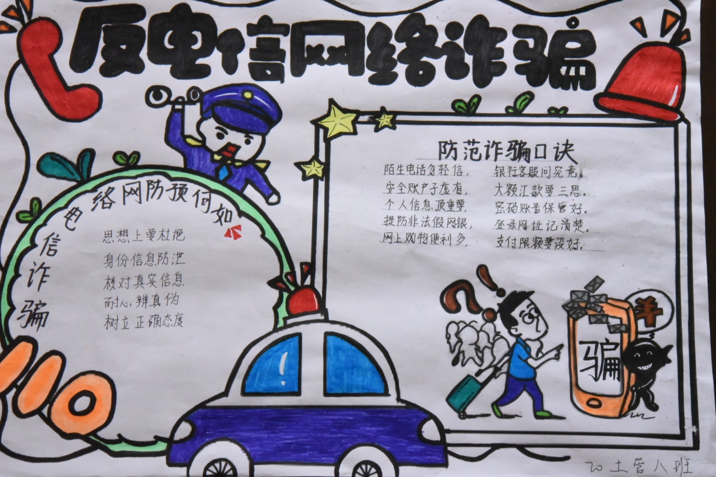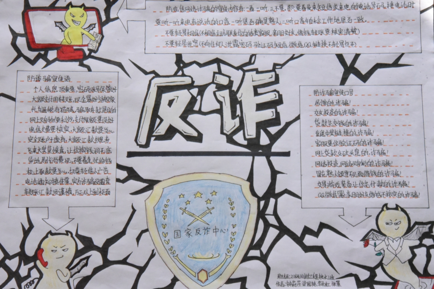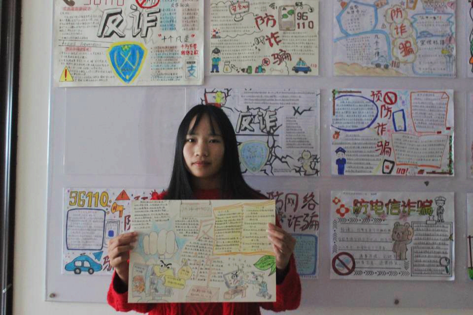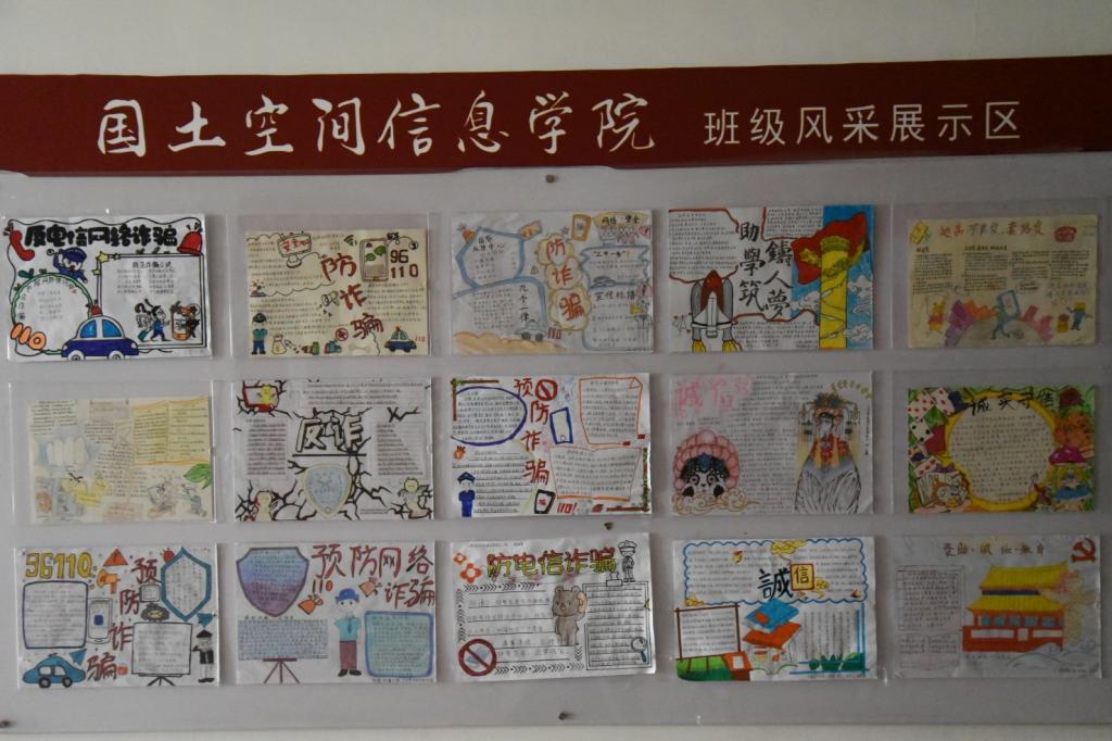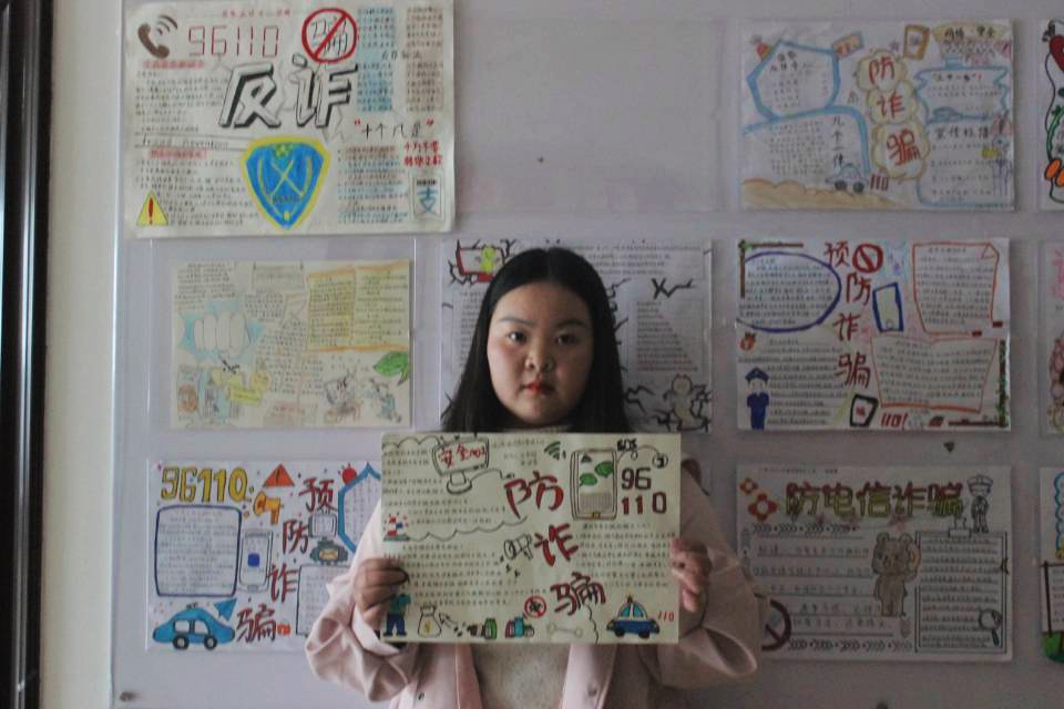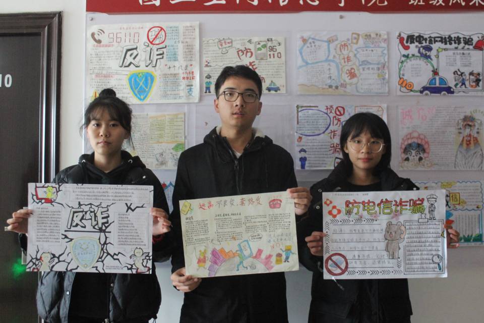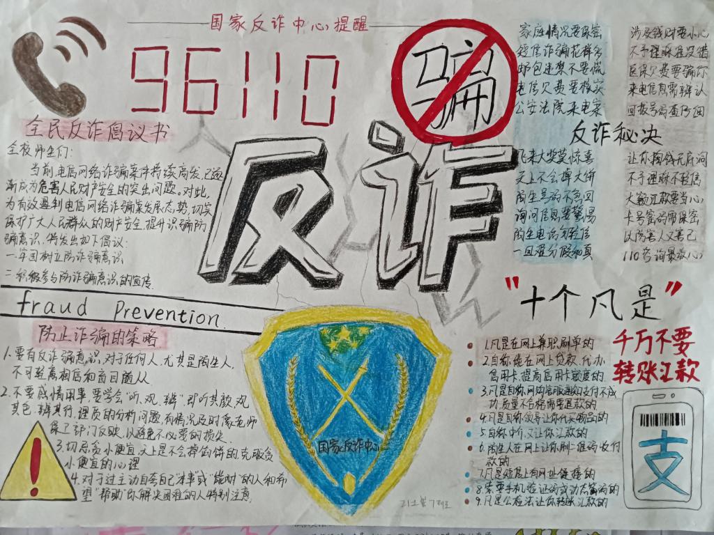 各班级制作的手抄报生动形象,用画写的方式将常见的电信诈骗手段、形式、危害等展示了出来,有利于提高同学们的反诈意识,同时也丰富了反诈宣传的形式。