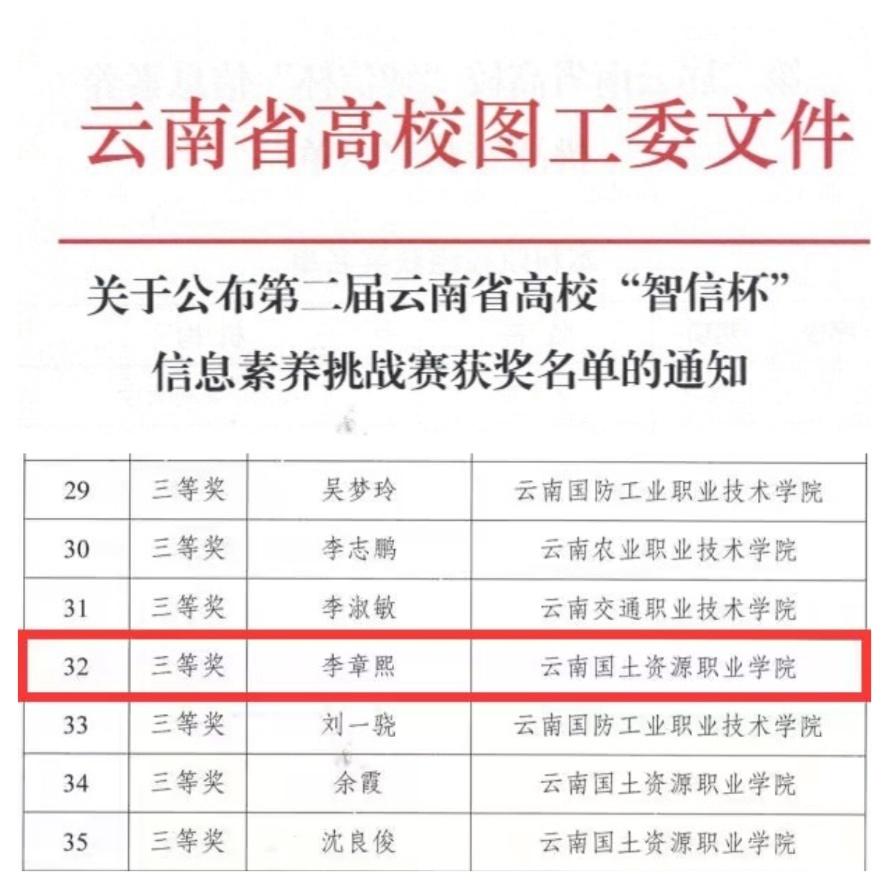 近日,由云南省高等公司图书情报工作指导委员会主办,各高校图书馆和北京智信数图公司承办的“第二届云南省高校‘智信杯’信息素养挑战赛”圆满结束公司22土管1李章熙同学荣获三等奖。