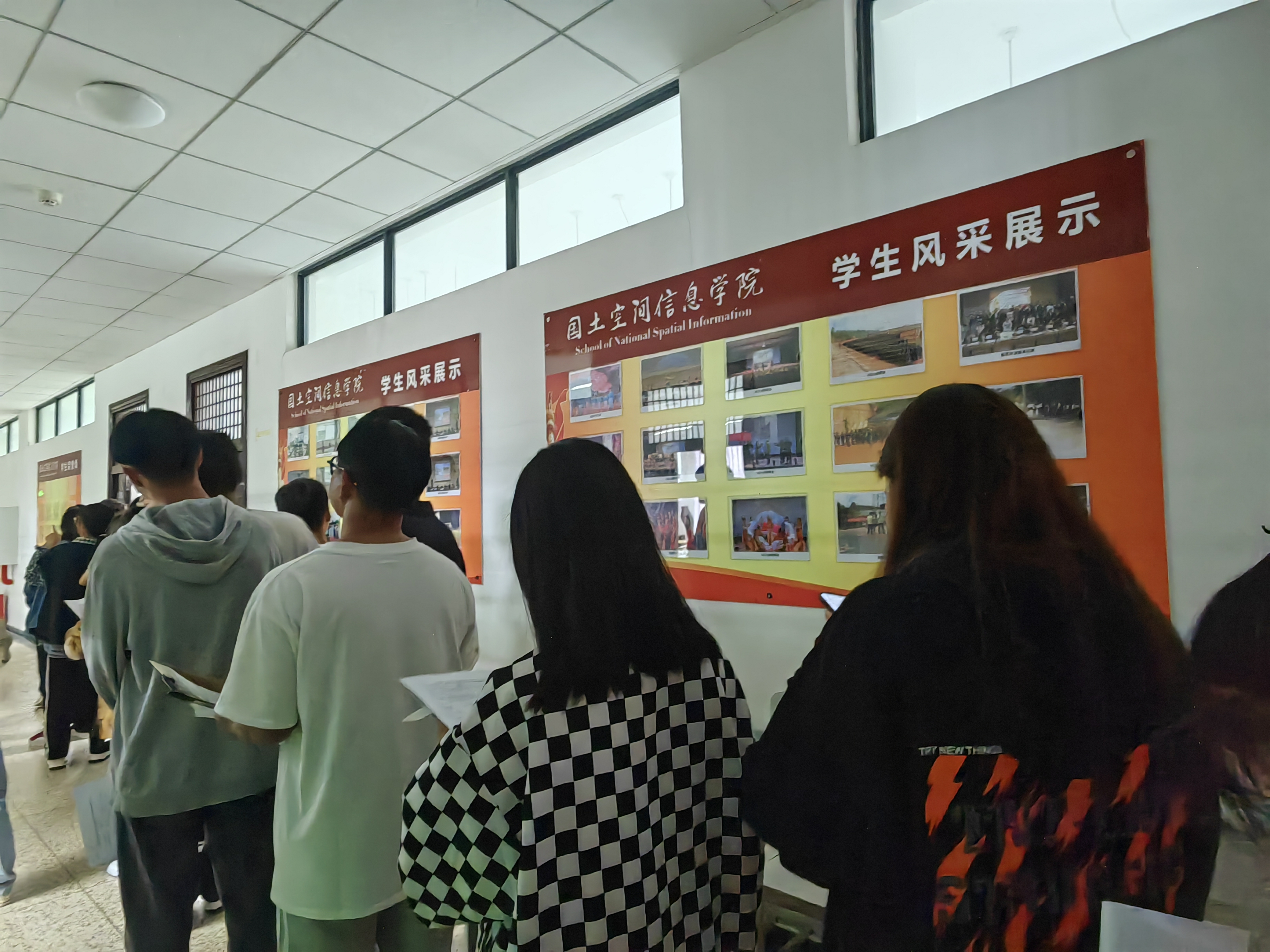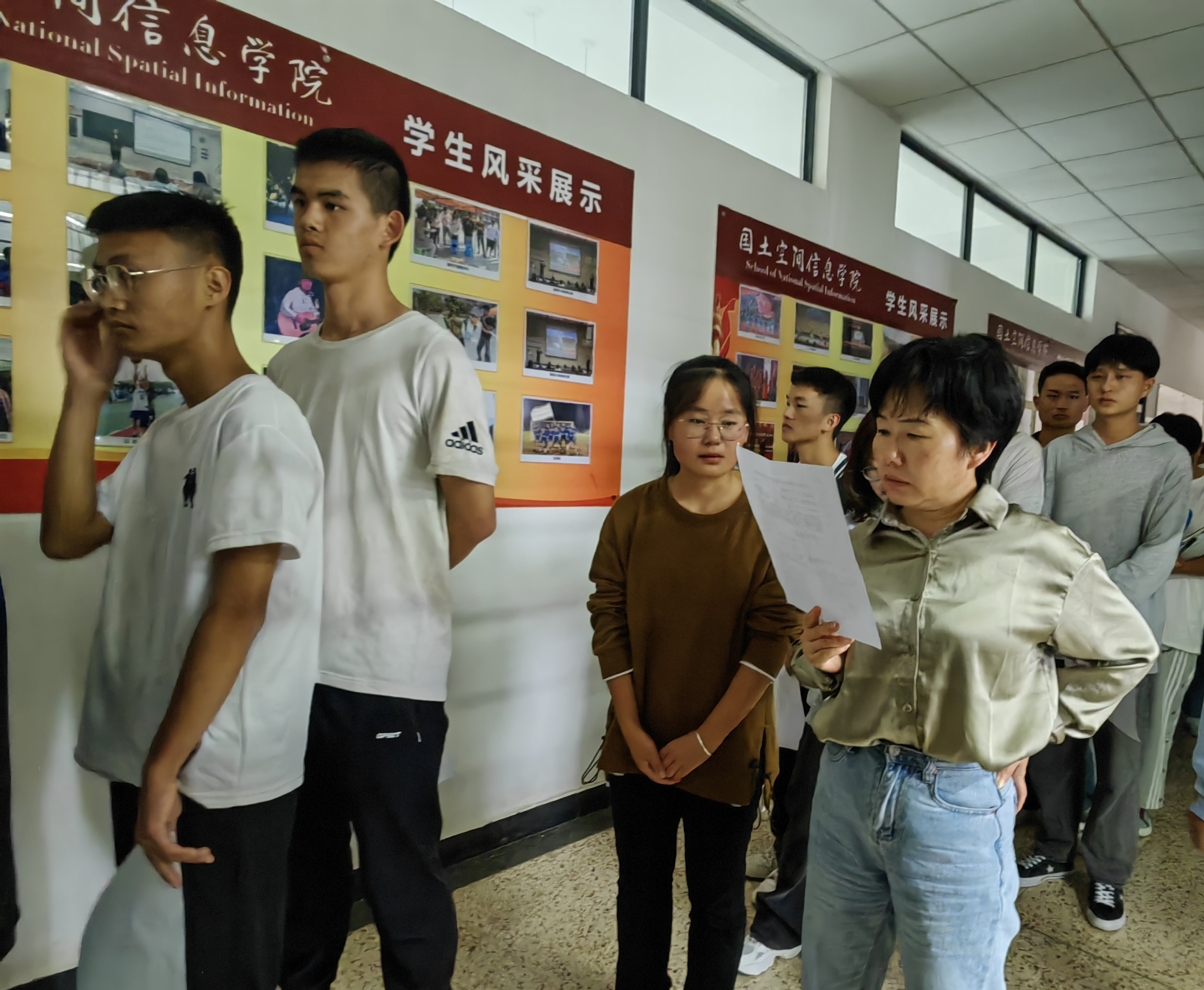 2022级前来参加面试的员工,井然有序地在教室外排队等待面试开始。公司党总支书记高昆,辅导员老师陈宪勇也在现场关注招聘情况,并与员工亲切交谈。