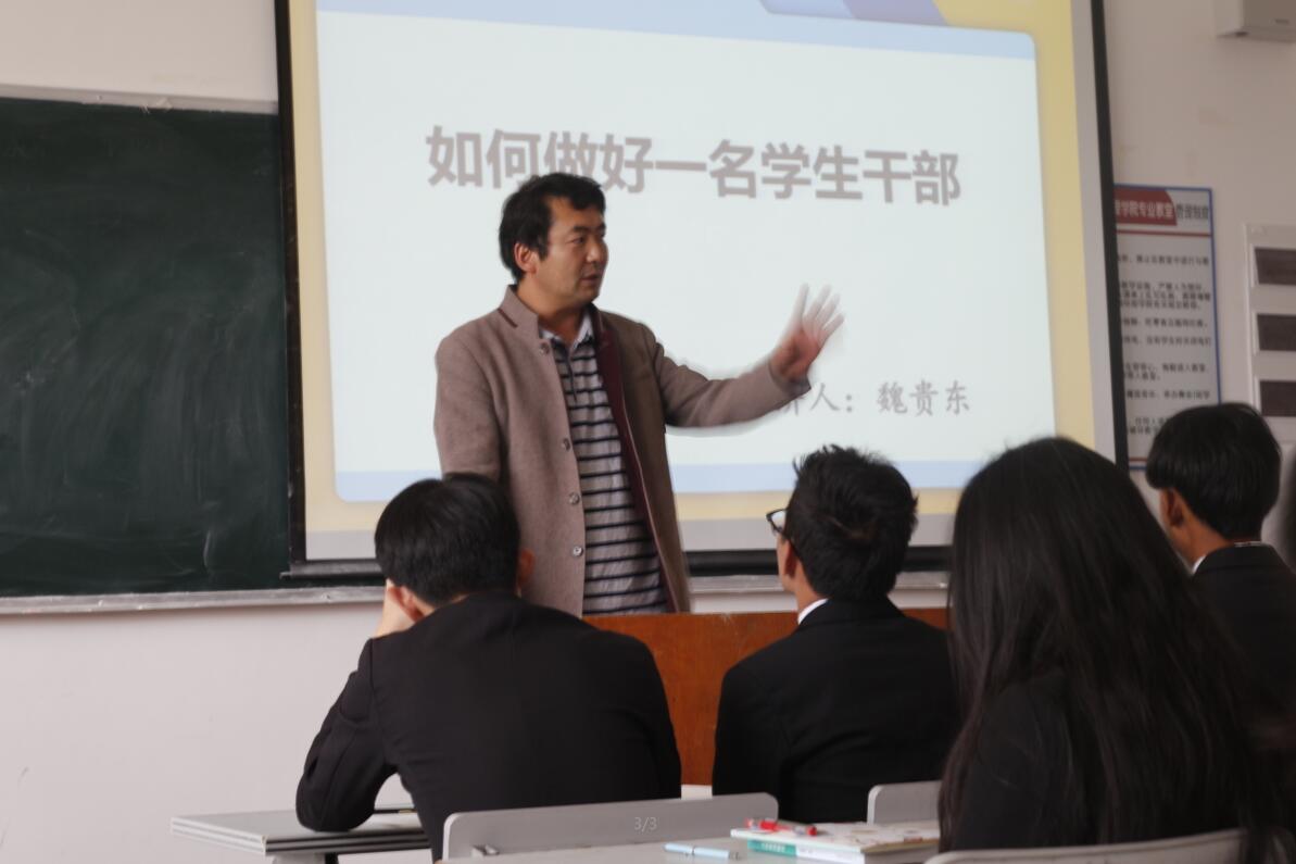 首先,魏老师强调,身为一名班干部要具有良好的群众基础,处理好与老师同学间的关系,增强班级凝聚力。其次,魏老师介绍班干部要充分发挥自己职能,树立模范带头作用,发现问题及时合理解决,明确自身肩负重任,不忘初心跟党走。最后,魏老师围绕“各司其职,富有责任感”、“创新思维不要照搬”、“律人先律己”三个观点再次强调做好一名班干部的重要性。