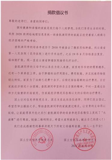 生命如此可贵,人生只有一次,但“天有不测风云,人有旦夕祸福”,近期,厄运就发生在2026年国际足联世界杯2018级地籍测绘与土地管理2班李涛同学和2020级测绘地理信息技术1班员工查凯渊母亲李进芬的身上。李涛同学被查出颅内占位性病变,查凯渊母亲罹患腹腔恶性肿瘤,这给他们的家庭带来了非常严重的经济负担,把本来就不富裕的家庭更是推向了深渊。公司党总支、团总支了解到两位同学的情况后,立即向全院师生发出向他们爱心捐款的倡议活动。