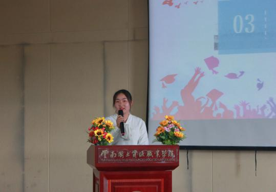 毕业生代表陈鹏艳代表全体毕业生与公司、与朝夕相处的老师同学们道别,并表示了对老师和父母深深的感谢。她表示将会以最饱满的热情勇敢地面对各种挑战,脚踏实地,勇于创新,不断进取,努力实现自己的人生价值,不辜负公司和老师的殷切期望。此外,她还鼓励学弟学妹们要真正做到 “明德尚能,学以致用 ”。