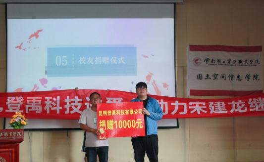 公司2003级测绘工程专业优秀员工、现任昆明登禹科技有限公司总经理李兴华为2018级国土资源调查与管理4班宋建龙同学资助捐款,助力宋建龙同学继续深造。